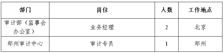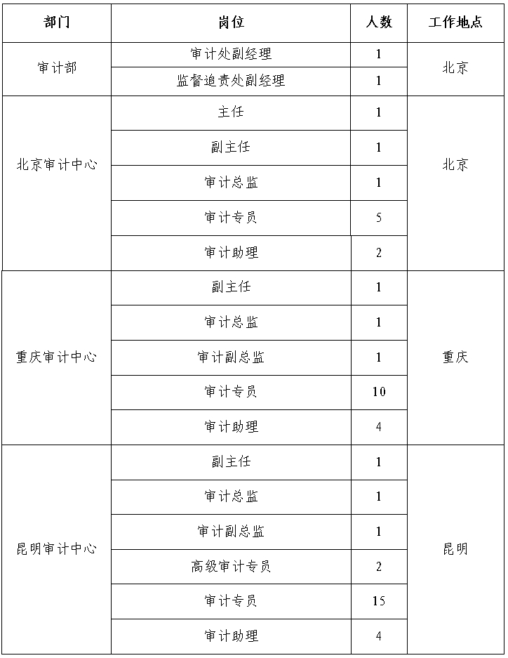 根據(jù)工作需要,經(jīng)研究決定,現(xiàn)面向社會(huì)公開招聘方式補(bǔ)充集團(tuán)總部、有關(guān)單位審計(jì)人員65人,F(xiàn)將有關(guān)事項(xiàng)公告如下: