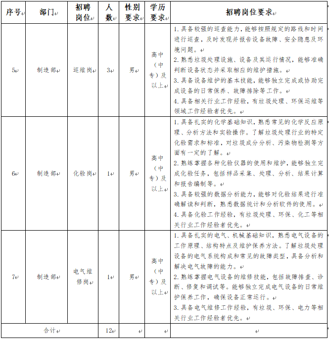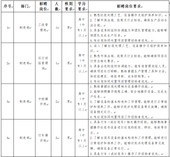 3.身體條件:身體健康,無(wú)恐高、高血壓等不適合一線生產(chǎn)崗位工作的疾病,具備一定的體力和耐力,能夠適應(yīng)垃圾處理現(xiàn)場(chǎng)的工作環(huán)境。
