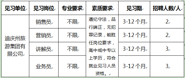 迪慶州旅游集團(tuán)設(shè)置就業(yè)見習(xí)崗位10個,擬招聘青年就業(yè)見習(xí)人員10人(詳見下表)。