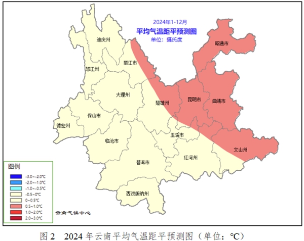 全省大部地區(qū)降水接近常年同期到偏少,氣溫接近常年同期到偏高。據(jù)氣象部門預(yù)測,降水:迪慶州西北部、怒江州北部、昭通市東北部、曲靖市東北部邊緣地區(qū)偏多10%—20%,其余大部地區(qū)接近常年同期到偏少,其中西雙版納州、普洱市中西部、臨滄市中南部、保山市南部、德宏州中南部偏少10%—20%(見圖1)。氣溫:全省大部地區(qū)接近常年同期到偏高,其中文山州中北部、曲靖市、昭通市、昆明市、楚雄州東北部、麗江市東部偏高0.5~1.0℃(見圖2)。重點(diǎn)關(guān)注:冬春季階段性強(qiáng)冷空氣引發(fā)的低溫冰凍雨雪天氣;2月下旬至4月上旬滇東北、滇西北及高海拔地區(qū)倒春寒天氣;春季冰雹大風(fēng)等強(qiáng)對(duì)流天氣;春末夏初氣象干旱;主汛期強(qiáng)降水引發(fā)的洪澇和地質(zhì)災(zāi)害,區(qū)域性氣象干旱。