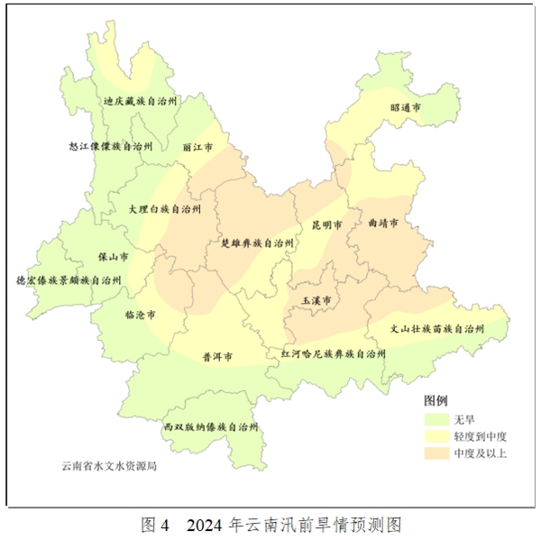 汛前尤其是4月至5月全省大部旱情偏重。據(jù)水文部門預(yù)測,預(yù)計(jì)1月至5月全省主要江河來水整體偏少,全省部分中小河流可能斷流,汛前昆明市主城區(qū)、玉溪市紅塔區(qū)、楚雄州楚雄市、臨滄市臨翔區(qū)存在較大供水壓力。滇中大部、滇東北大部、滇東大部、滇西北東部和北部、滇西東部、滇南北部發(fā)生輕度至中度干旱的可能性較大,其中曲靖市中南部、文山州北部、紅河州北部、玉溪市東部、昆明市東南部和北部、昭通市西南部、楚雄州大部、普洱市北部、臨滄市東北部、大理州東南部、麗江市南部以及金沙江、紅河、瀾滄江干熱河谷地區(qū)可能發(fā)生中度及以上干旱(見圖4),抗旱形勢嚴(yán)峻。建議:密切監(jiān)測旱情動(dòng)態(tài),提前謀劃做好抗旱減災(zāi)準(zhǔn)備,提高抗旱保供能力,確保生活生產(chǎn)生態(tài)用水安全。