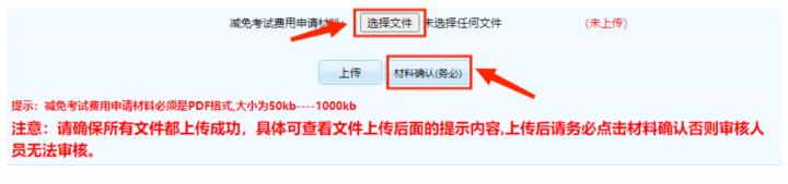 3.上傳最低生活保障家庭人員證明材料(材料要求:低保證或家庭所在地的民政部門出具的城鄉(xiāng)低保證明的掃描件,需在材料空白位置注明報(bào)考者姓名、證件號(hào)碼和聯(lián)系電話)。證明材料上傳成功后,點(diǎn)擊“材料確認(rèn)(務(wù)必)”按鈕。