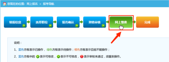 1.通過資格審查的報(bào)考者,點(diǎn)擊報(bào)考導(dǎo)航頁面“網(wǎng)上繳費(fèi)”按鈕進(jìn)入繳費(fèi)頁面。