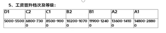 入職前1—6個月執(zhí)行5000-6000元;6—12個月可晉升為6800-7300元;每半年考核晉升一次,月薪資漲幅600-1200;工作滿一年工資8000元左右;工作滿2年,月薪資可達(dá)9000-12000,工作滿兩年半,月薪資可達(dá)12000-14000。