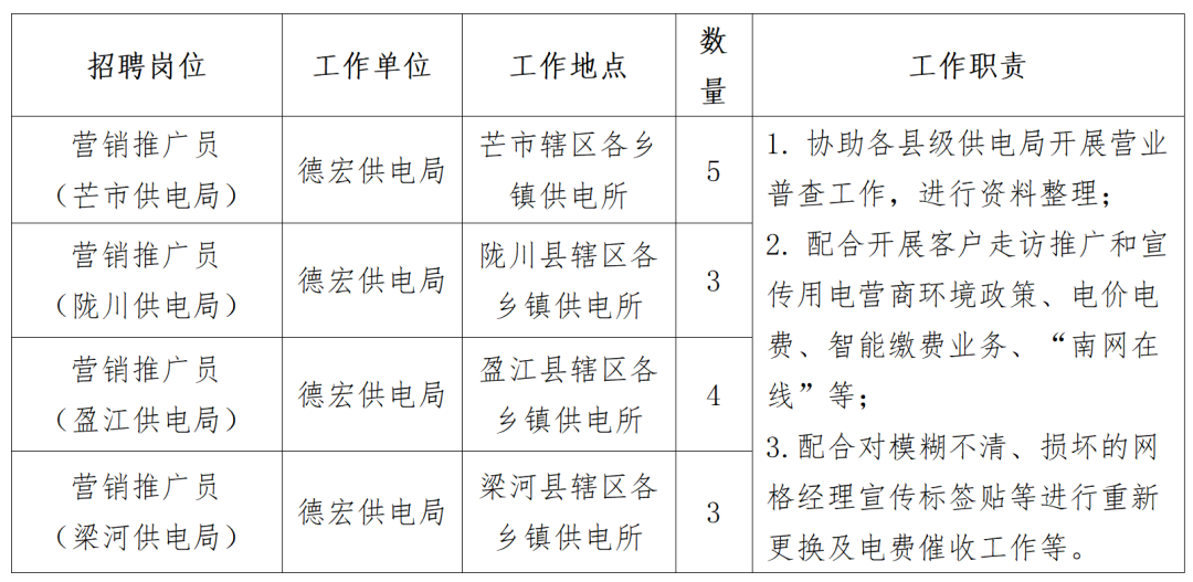 為滿足季節(jié)性、短期性項目工作需要,南方電網(wǎng)云南德宏供電局現(xiàn)面向社會公開招聘短期項目制用工15人。現(xiàn)將有關(guān)事項公告如下: