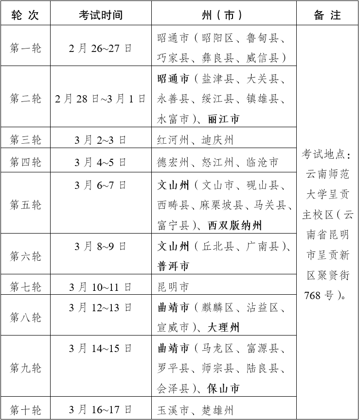 云南師范大學(xué)呈貢校區(qū)(地址:昆明市呈貢新區(qū)聚賢街768號),考生、涉考人員均從6號門進(jìn)出校園。