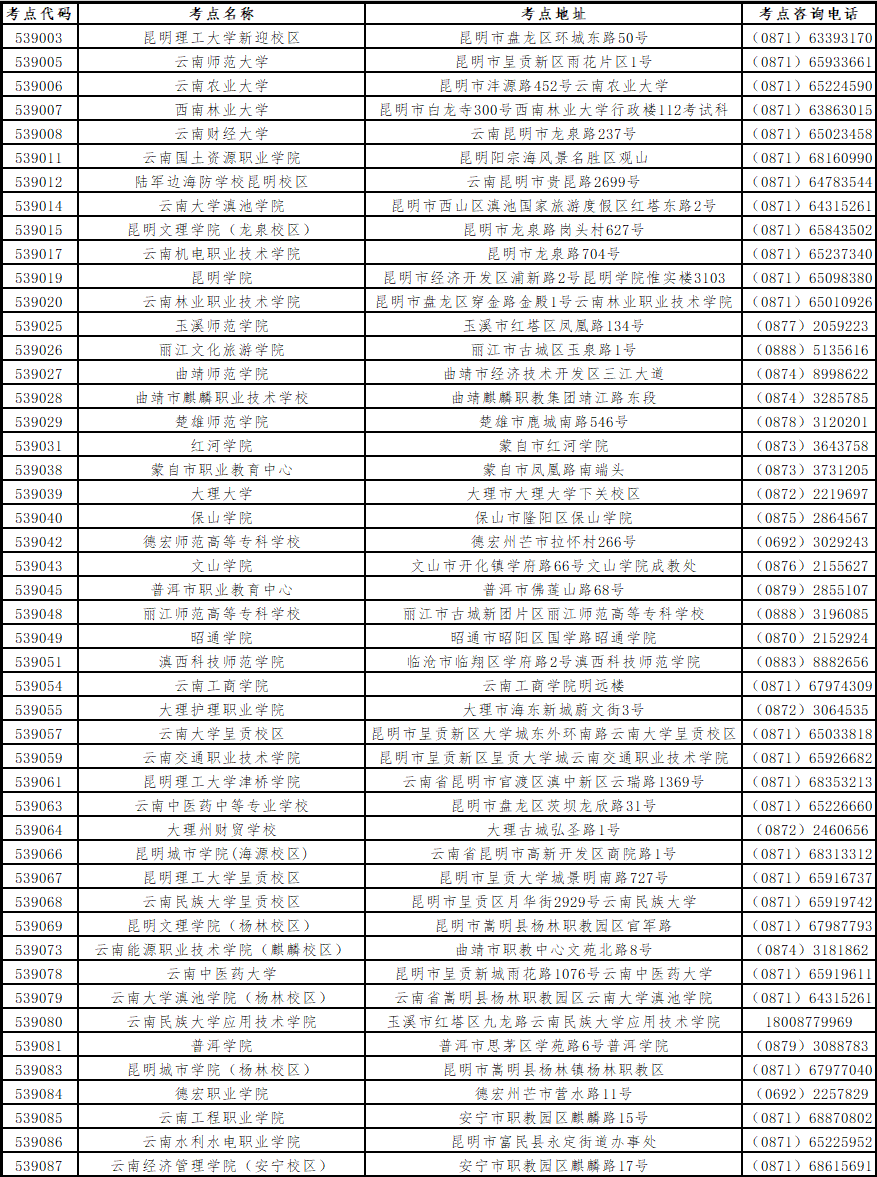 注:本次考試云南中醫(yī)藥中等專業(yè)學校、云南工程職業(yè)學院、昆明城市學院(楊林校區(qū))3個考點接受社會考生報考,其他考點只接受本校在校生報考。